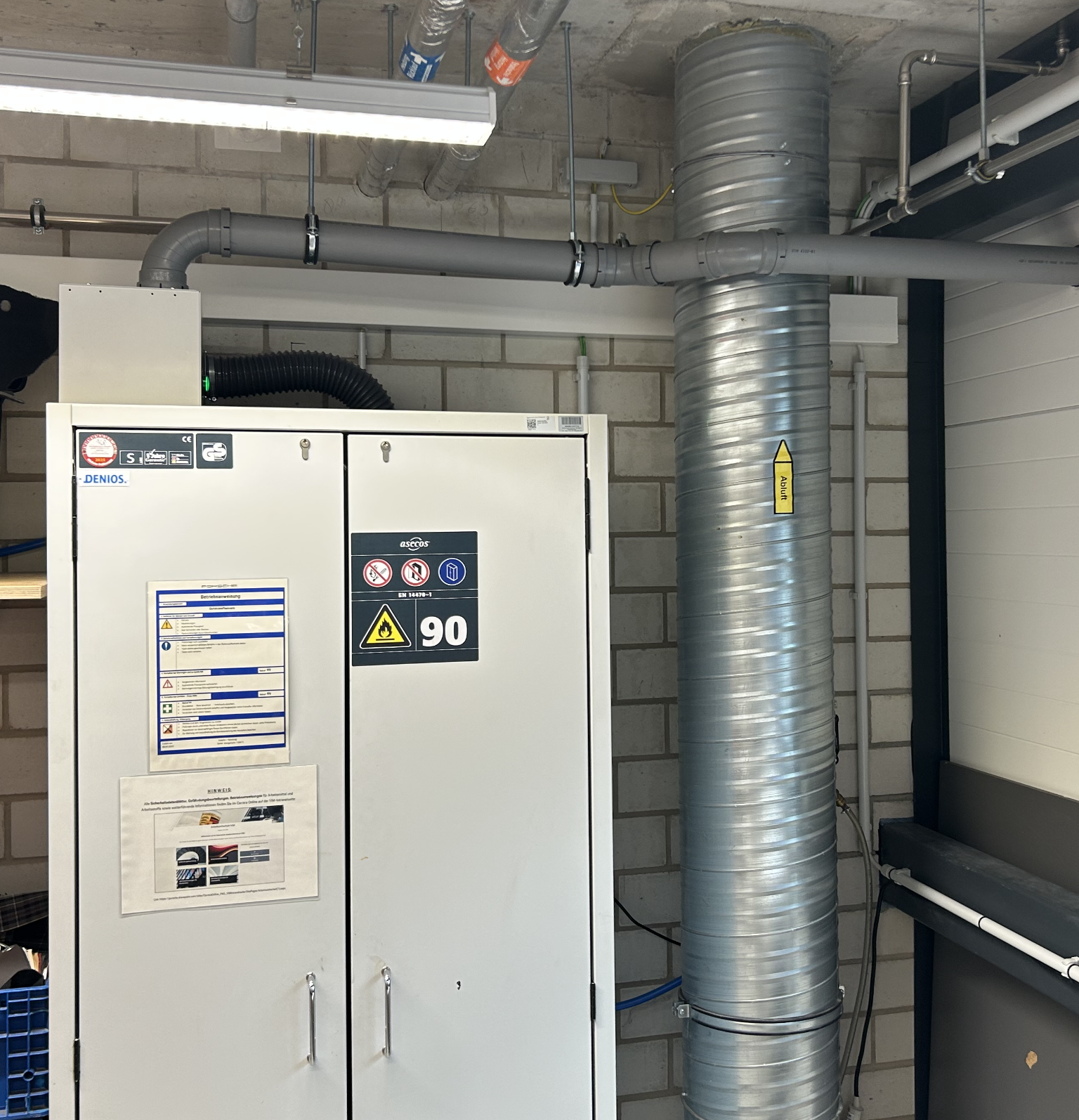 Damit Gefahrstoffe sicher gelagert und genutzt werden können, müssen Gefahrgutschränke dauerhaft und Arbeitsplätze bedarfsgerecht entlüftet werden. Wir planen und installieren die Abluftleitungen passgenau nach Norm, unter Berücksichtigung aller sicherheitsrelevanten Anforderungen: